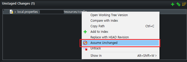 2. 제외하고자 하는 파일의 마우스 오른쪽 버튼 클릭 후 Assume Unchanged 클릭 시 Unstaged Changes 파일에서 제외된다.